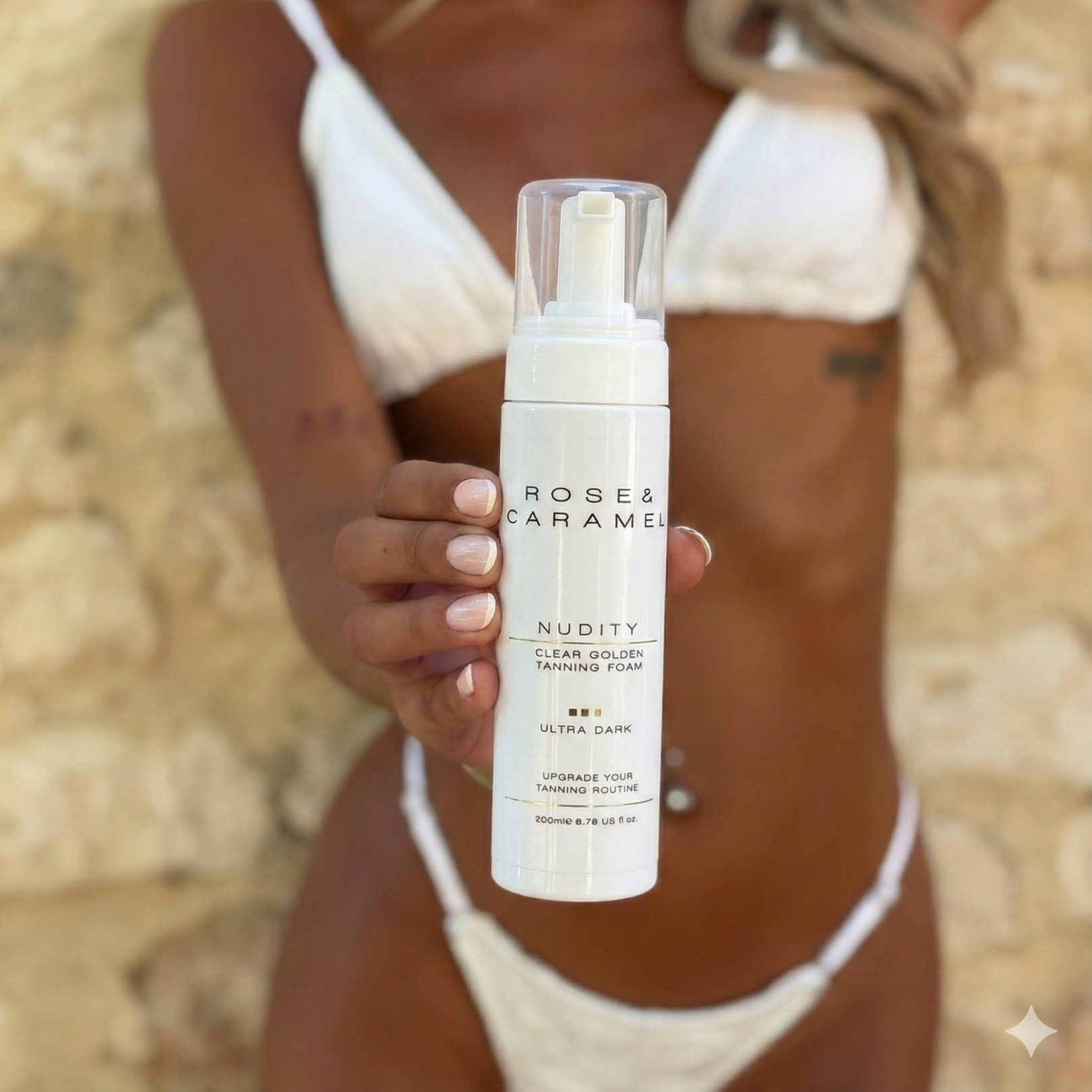 1. Apply a generous amount of foam to a tanning mitt and use circular motions to spread evenly.